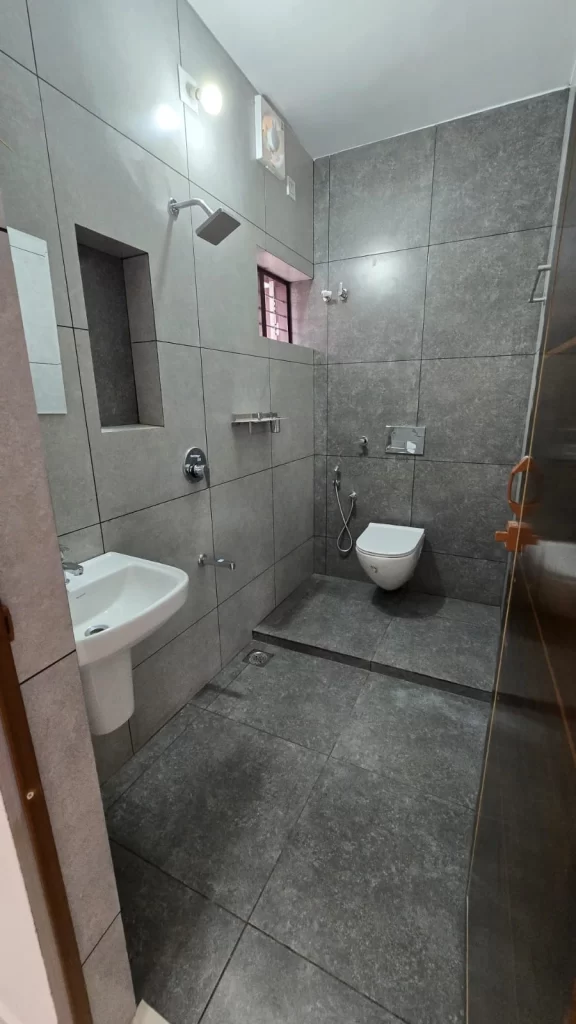 Toilets: Flooring with anti-skid ceramic tiles (300mm x 300mm) and glazed tiles dado (300mm x 450mm) upto a height of 210 cm. Good quality white sanitary fixtures (Cera, Hindware or equivalent brands) and CP fittings (OMCO or equivalent brands).Hot and cold water mixer tap with shower and provision for fixing wall-mounted geyser in toilets.
